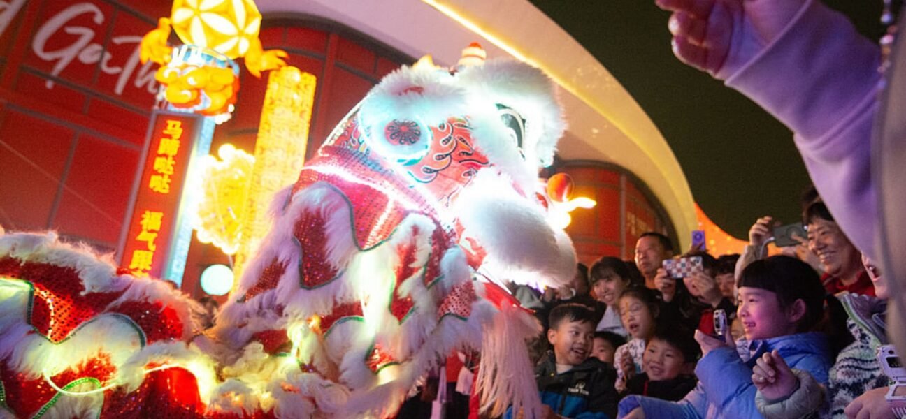 A dozen actors perform a traditional lion dance in front of Todtown shopping mall ahead of the Chinese Lunar New Year in Shanghai, China, on Feb. 13, 2026, during the.